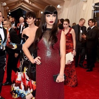 I highly disliked Adriana's look which is never the case. My goodness that horrible "bangs" hair piece looks so fake and the way it is cut is completely uneven.Whoever did her hair needs to be fired. The dress makes her look bigger then she actually is and completely hides her waist line-makes her look look like she has rectangle body shape. Poor hair and poor styling, it does NOTHING for her, but of course that is IMO.