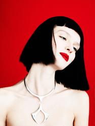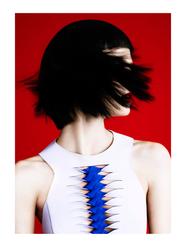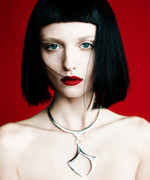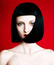 Shear Beauty – Amanda Norgaard trades in her blonde locks for a black and sheared coif featured in the October 12th issue of WWD Beauty Inc. Photographer Billy Kidd lenses the Danish beauty in striking portraits with hair by Charlie Taylor and red lips courtesy of makeup artist Itsuki. / Styling by Isabel Dupre, Props by Amy Chin