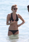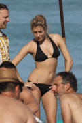 The “Shattered Glass” actress seemed rather low-key as she meandered around the sand, sporting a black bikini top and a pair of grey knit shorts with flip flops and sunglasses as she toted a bag with a slogan that read “"Jesus Died For Somebody’s Sins”.
