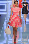 Dresses were pretty, their rounded silhouettes broken by geometry: a mosaic of tiny square tiles at neck or even smaller pieces scattered above the hem. The light and airy feeling was carried through in colors like a watery aquamarine or a beige cascade of vertical ruffles. A dash of red matched the models’ scarlet lips.