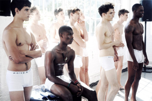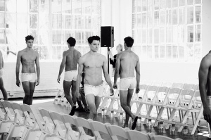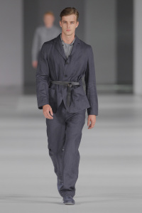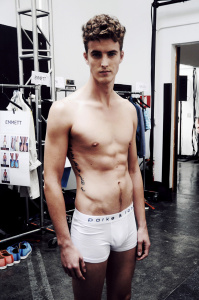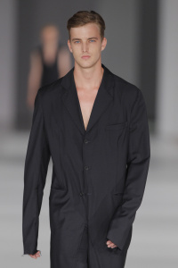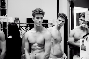 A model prepares backstage at the Robert Geller fashion show during Mercedes-Benz Fashion Week Spring 2014 at Pier 59 on September 7, 2013 in New York City. (September 6, 2013 - Source: Charles Norfleet/Getty Images North America)