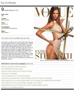In the past year, despite VS, Karlie has still booked more campaigns, editorials and covers than Joan, and she has the most Vogue covers out of all the girls in the Top 50. Boggles my mind that she isn't #1.