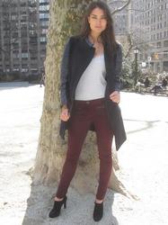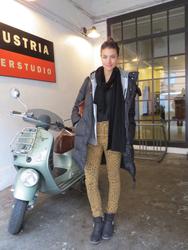 Lauren wears: Pants by Cheap Monday, (she bought it in San Francisco), top by Top Shop, hoodie American Apparel, coat by Comptoirs des Cotonniers, boots and Scarf by All Saints and Mulberry bag.