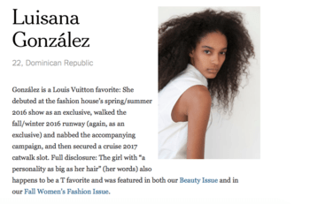 González made a major impact with her larger-than-life curls and vamp lips when she debuted the second look on the Louis Vuitton runway last season—and grabbed the attention of designers from New York to London. This season, she made her New York Fashion Week debut at Alexander Wang, Michael Kors, Rodarte, Coach, Oscar de la Renta, Proenza Schouler, Tommy Hilfiger, Sies Marjan, and more. Not bad for a newcomer.