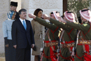 Turkish President Abdullah Gul and his wife Hayrunnisa Gul are received by Jordan's King Abdullah and his wife Queen Rania upon their arrival for a three-day official visit in Amman on December 1, 2009 in Amman, Jordan.