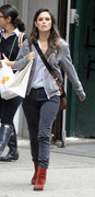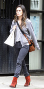 I like the dress, but a black duffle coat in May? Makes it look like it's November and it clashes with the light texture and color of the dress and shoes which are season appropriate.