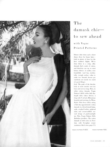 US Vogue November 1, 1957 The Damask Chic - To Sew Ahead With Vogue Printed Patterns Photo Roger Prigent Model Evelyn Tripp vogue
