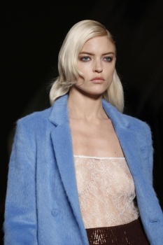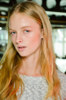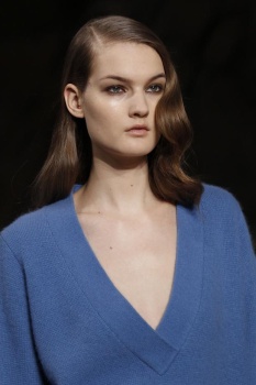 Making a subtle change to the status quo, hairstylist Neil Moodie took last season’s tousled texture and blow-dried it into submission. “I’m going for a smoother finish than what we have done in the past,” he explained, gluing color-matched extensions into models’ manes and using a large round-barreled brush to curl the ends under. In keeping with the slight sixties feel, Moodie applied a pump of Moroccanoil Volumizing Mousse and back-combed strands at the roots, allowing them to settle for ten minutes before brushing them out again. “It’s enough to give the hair a little height at the crown,” he pointed out of the technique.