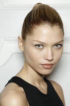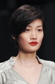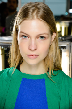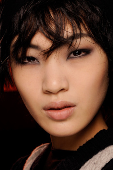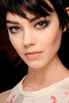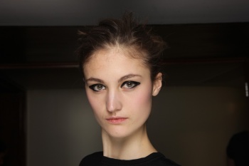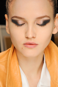 “A pinup who is not quite a pinup” is how makeup artist Lucia Pieroni described Jonathan Saunders’ woman for Fall while backstage at the designer’s show. “She’s a bit grunge, a bit nineties, and there is a touch of the Marilyn Monroe and Courtney Love about her,” Pieroni continued as she conducted mini facial massages on site with Clé de Peau Beauté Gentle Protective Emulsion. Citing the artist Allen Jones, Pieroni started in on “smudgy brown eyes” that she built by rimming waterlines with MAC Eye Pencil in Coffee before blending that out for a “worn-in” feel. Concentrating her mascara wand on the base of the lashes rather than pulling it through to the tips, Pieroni was quick to point out that this was not intended to be a “lashy look.”