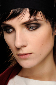 For the eyes, “We used a waxy crayon in a really intense grey - up close to the lash line - and blended it to the brows which we brushed up for a boyish feel,” Garland said. Lips remained natural with just the hint of a stain.