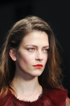 “There’s a lot of lip going around,” Giorgio Armani international makeup artist Linda Cantello said backstage at the designer’s Fall show. She’s certainly not wrong. The crimson and berry pouts that gained momentum in New York and London have really hit their stride in Milan, turning up everywhere from Fendi and Antonio Marras to Prada, Bottega Veneta, and Marni. “The collection is very ‘garçonne,’ so he didn’t want too much makeup,” Cantello explained of Mr. Armani’s boyish tailoring with a slight 1930s air. “But I’ve still got to get my thing in there.”