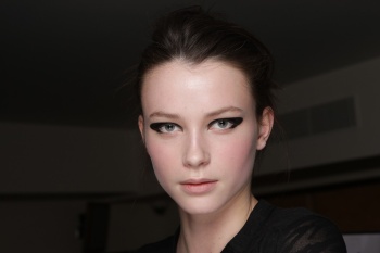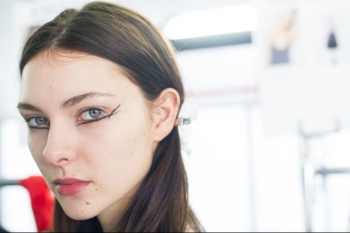 LONDON — Makeup artist Val Garland interpreted the Hitchcock theme at Temperley with an elongated eye, done with L'Oréal Paris' Superliner Blackbuster and finished with False Lash Flutter Mascara. Brows remained natural with a little filler only where necessary.