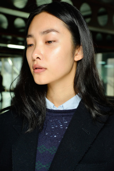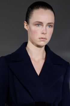 “This season, the Burberry girl is a little bit sixties and a bit mod; she is very cool,” Rowe pointed out, adding a slight variation to the house’s traditional groomed and glossy theme with a layering effort of Burberry Sheer Foundation and its Fresh Glow to give complexions a lit-from-within quality. The golden touches woven throughout the collection inspired a gilded highlight on the inner corners of eyes and on the Cupid’s bow of mouths, courtesy of Burberry Lip Glow in Trench Kiss. “I want the lips to look succulent, like they have just been kissed,” the Burberry artistic consultant explained, slicking on an additional coat of Burberry Lip Mist in Nude Honey. Nails were given this season’s favorite, deep garnet manicure with two coats of Burberry lacquer in Oxblood.