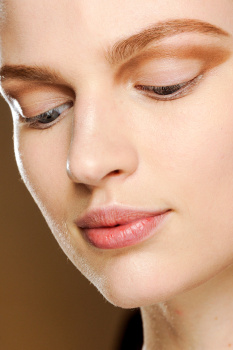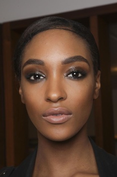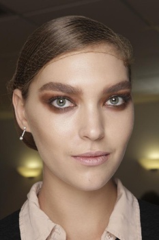 She said the look was achieved by filling in the natural arch using lots of thin strokes in the direction of the hair growth. Eyelids were painted a chocolate color with a pink undertone, outlined in a coffee shade, and then covered with Eight Hour Cream. Lips were painted in Sable Smoke, Coco Ravish, or Blush Nude according to skin tone.