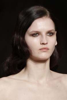 Instead, the high-octane glamour came from the hair. In a rare departure from the signature lank “skinny hair,” which left an indelible impression on the New York shows, Paul Hanlon was hard at work on a style that was, dare we say, rather ladylike in its construction. Smoothing and polishing the cuticle, Hanlon fashioned deep side parts before using a medium-barrel curling iron to create a forties-era bend throughout lengths.