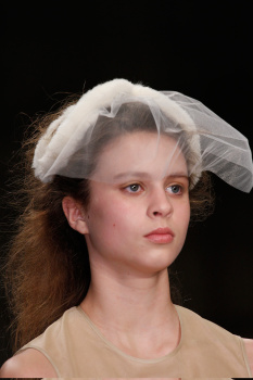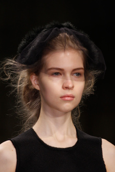 Pat McGrath used the opportunity to play with contours and shadow, keeping skin fresh and beautiful while creating an innovative eye shape in the process. “It’s literally in the socket and pulled out,” the makeup maestro explained of the warm gray cream pigment she brushed across the crease in a crescent shape that came to a soft point and then rejoined the outer corner of the eye. “Every girl is tailored,” McGrath elaborated, explaining that lids were primed if necessary to ensure that the neutral stroke of shadow showed up, although she erred on the side of caution to prevent an overly light, sixties effect. Taking down lips with a touch of concealer, McGrath curled lashes and left them bare while adding strength to the brows to effectively frame the face.