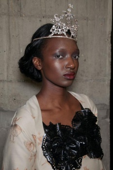 The macabre feeling was echoed in the makeup, too. “This girl is Goth,” Lucia Pieroni deadpanned, revealing that Tim Burton was a big inspiration for the pale, luminescent complexions she built using copious amounts of MAC Strobe Cream. Hollowing out eyes with MAC Paint Pots in Constructivist, a burnished brown, and Stormy Pink, a pale lavender, Pieroni concentrated the pigment to the inner corner of the lid to create depth before blending it underneath the lower lash liner to give off the appearance of “a sunken shadow.” Leaving lashes bare and taking lips down with a touch of concealer and lip balm, Pieroni was content to dub her handiwork “beautiful Burton.”