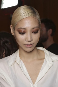 Lips came in Rouge Caresse shade 501, Bedroom Beige — outlined with liner number 656. Faces were kept fresh and real, employing BB creams and “lashings of Luminous Magique Highlighter,” Garland noted.