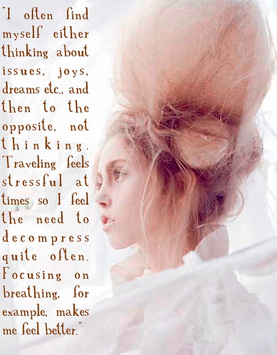 “I spend a good amount of time reading and playing crossword puzzles when I wish to enjoy the time. More than doing something "entertaining" I often find myself either thinking about issues, joys, dreams etc., and then to the opposite, not thinking. Traveling feels stressful at times so I feel the need to decompress quite often. Focusing on