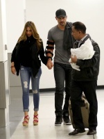 Newly engaged couple Sofia Vergara and Joe Manganiello walk hand in hand as they arrive back in Los Angeles for the first time since the 'True Blood' star proposed to the 'Modern Family' star.