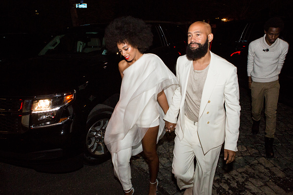Musician Solange Knowles (wearing Stephane Rolland with Stuart Weitzman shoes and a Lee Savage clutch) and her fiancee, music video director Alan Ferguson (wearing Costume National with an H&M shirt and Maison Martin Margiela shoes), arrive for their rehearsal dinner at the Felicity Street Methodist Church on November 15, 2014 in New Orleans, Louisiana.