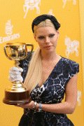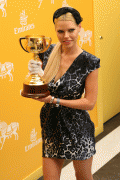 Sophie Monk holds the Melbourne Cup in the Emirates Marquee at the 2009 Melbourne Cup