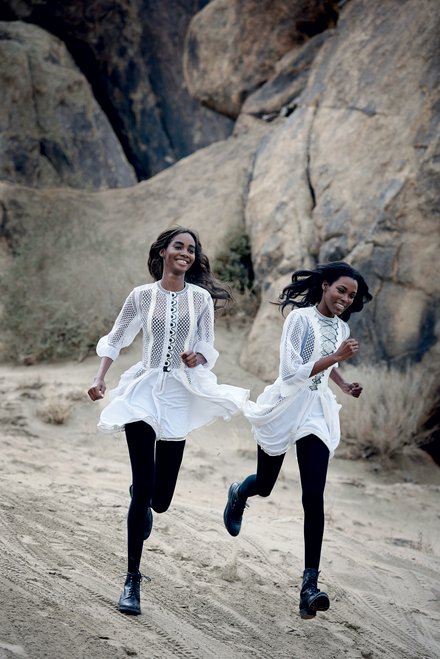 Indeed, Williams and Newman have been filling their résumés with choice appearances for brands like Valentino, Calvin Klein Collection, and Jil Sander, in addition to booking a number of campaigns: Williams is a current face of Calvin Klein, and Newman stars in Maybelline’s newly launched ads. Beginning their careers at roughly the same time—both were discovered by Saint International’s Dewight Peters—the pair have grown up together within the industry: Both girls attended the same school in Kingston and balanced work-related travel with a full slate of tests and assignments. Their camaraderie offers both a built-in support system, as well as the benefit of someone who knows exactly what they’re going through. “We go to the same castings, we work on our reports from school together and hang out all the time.” Newman shares. “When you work with someone you know so well, you feel a greater connection to the project.”